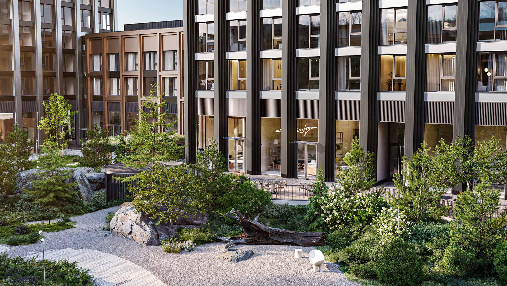 Территория жилого комплекса SET — это пространство, объединяющее природную красоту и современные технологии. Интегрированный лесной ландшафт в центре мегаполиса создает уникальную атмосферу, где каждый элемент благоустройства способствует комфортному отдыху и гармонии с природой. Концепция благоустройства, разработанная студией ландшафтного дизайна L.BURO, вдохновлена карельскими пейзажами, создавая атмосферу нетронутой природы.