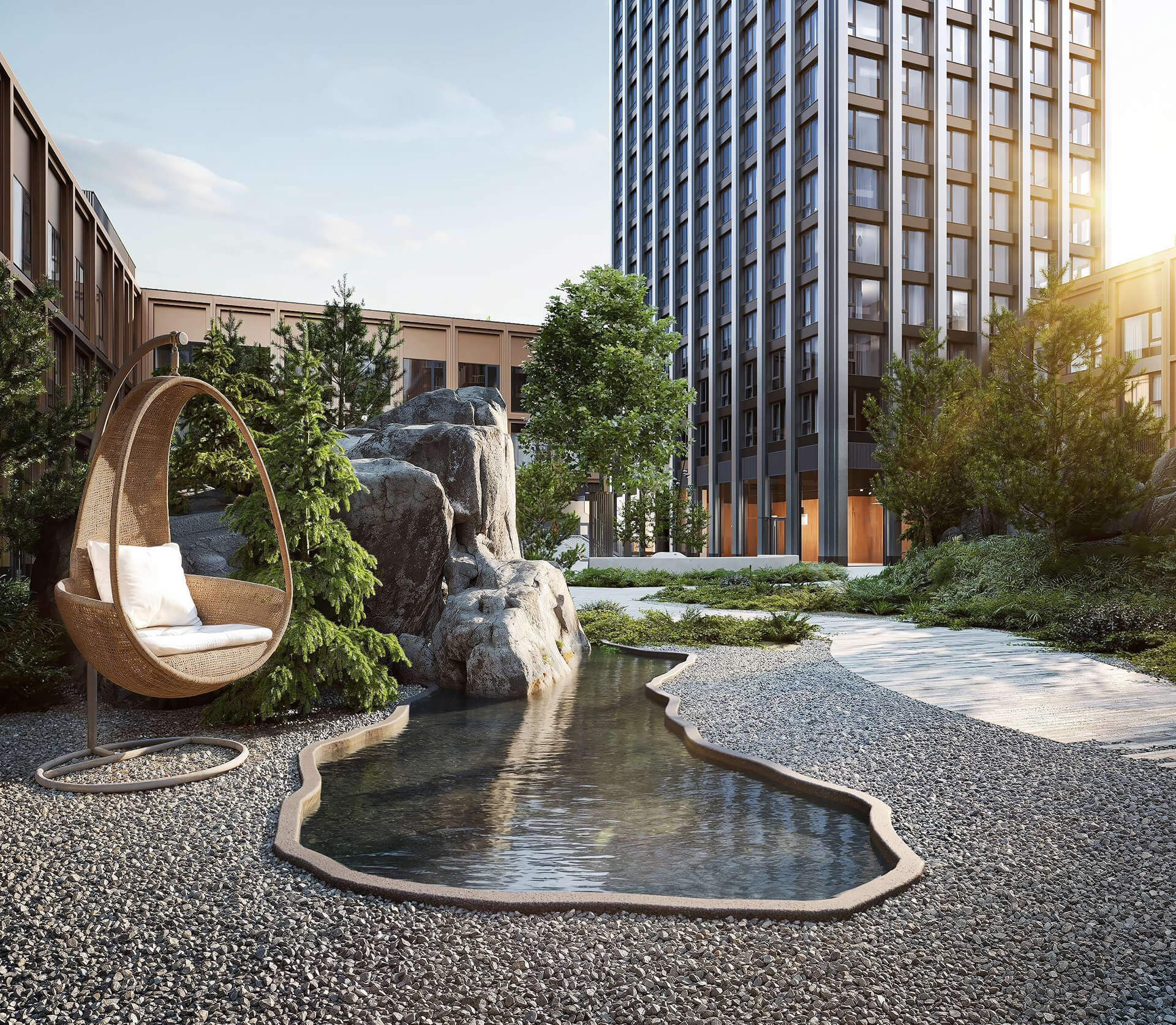 Рельеф территории подчеркивается дикорастущей растительностью, камнями и скальными породами. Здесь найдется место как для активного отдыха на воркаут-площадке с современными тренажерами, так и для расслабления на шезлонгах под стильным навесом. Уникальная площадка для йоги и уличная терраса предоставляют идеальные условия для медитации и общения на свежем воздухе. В центре двора расположен водоем, напоминающий лесное озеро, окруженное камнями и деревьями, создавая спокойную атмосферу для отдыха.